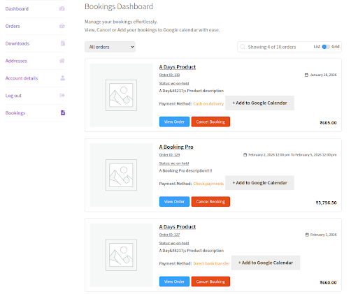 - A separate booking list is offered on the WC order listing panel with a specialized WooCommerce Bookings tag for easy sorting.